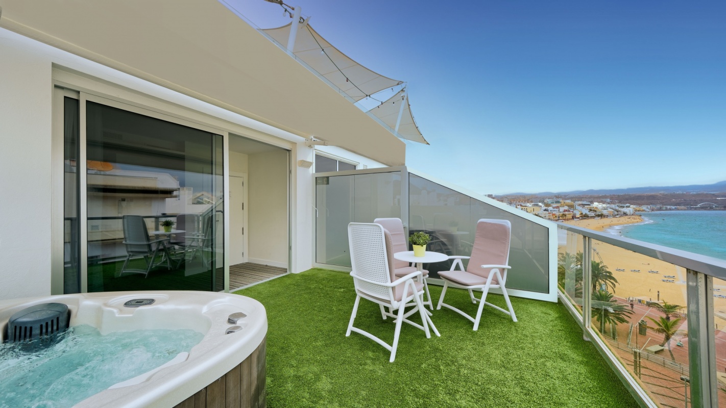 Vous tomberez amoureux de sa terrasse avec jacuzzi, elle dispose d'un store pour vous protéger du soleil, mais n'oubliez pas qu'elle n'offre pas d'intimité lorsqu'elle est à l'extérieur, au 7ème étage à côté du rooftop, avec vue sur la plage de Las Canteras au bord de la rue Los Gofiones.
